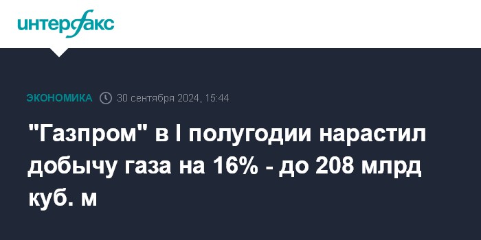 Москва. 30 сентября. INTERFAX.RU - Добыча газа (природного и попутного) группы "Газпром" на территории России за 6 месяцев 2024 года выросла на 16%, до 208,14 млрд куб. м с 179,45 млрд куб. м за январь-июнь 2023 года, сообщается в отчете эмитента ПАО "Газпром".