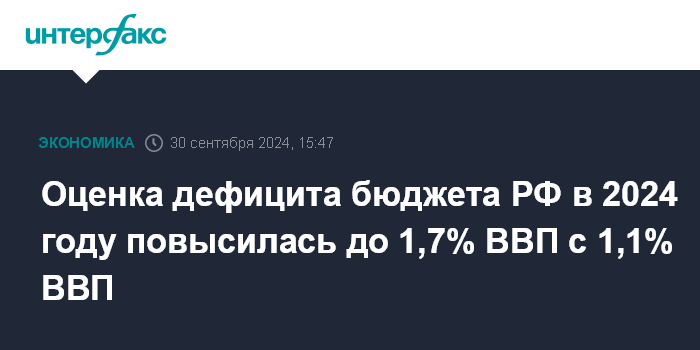 Оценка дефицита бюджета РФ в 2024 году повысилась до 1,7% ВВП с 1,1% ВВП
