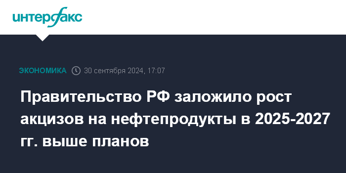 Москва. 30 сентября. INTERFAX.RU - Правительство России заложило дополнительный рост акцизов на нефтепродукты в 2025-2027 годах, следует проекта изменений в Налоговый кодекс.
