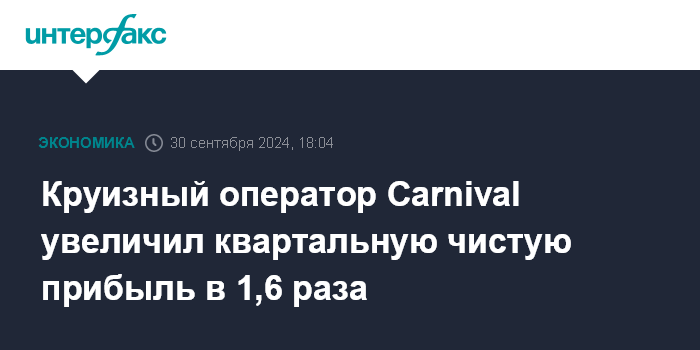 Москва. 30 сентября. INTERFAX.RU - Крупнейший в мире круизный оператор Carnival Corp. увеличил чистую прибыль в третьем финансовом квартале в 1,6 раза, зафиксировав рекордные показатели операционной прибыли и выручки.