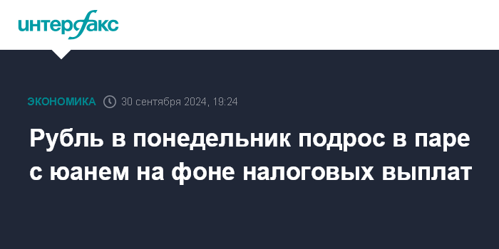 Москва. 30 сентября. INTERFAX.RU - Китайский юань понизился на Московской бирже по итогам торгов в понедельник, рубль подорожал в рамках спроса на рублевую ликвидность в день перечисления в бюджет налоговых выплат. На понедельник пришелся единый день уплаты налогов в сентябре, когда компании-экспортеры выплатили НДС, налог на прибыль, страховые взносы и НДФЛ.