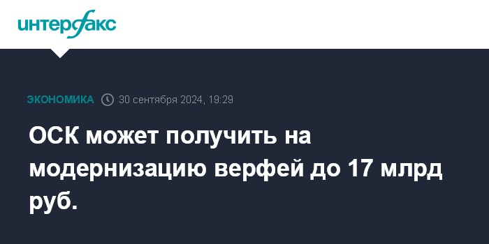 ОСК может получить на модернизацию верфей до 17 млрд руб.
