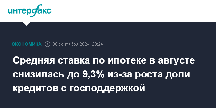 Средняя ставка по ипотеке в августе снизилась до 9,3% из-за роста доли кредитов с господдержкой