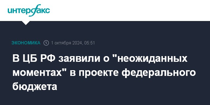 Москва. 1 октября. INTERFAX.RU - Банк России планирует проанализировать и прокомментировать проект федерального бюджета на 2025 год и плановый период 2026-2027 годов, однако уже сейчас отмечает наличие неожиданных моментов, которые могут потребовать корректировки.