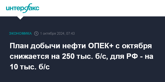 План добычи нефти ОПЕК+ с октября снижается на 250 тыс. б/с, для РФ - на 10 тыс. б/с