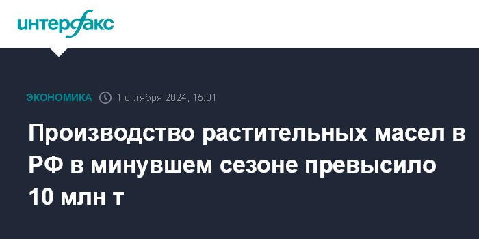 Москва. 1 октября. INTERFAX.RU - Масложировая отрасль РФ в 2023/24 сезоне (сентябрь 2023 - август 2024 гг.) произвела более 10 млн тонн растительных масел, что на 8% больше, чем за предыдущий сезон. Об этом сообщили "Интерфаксу" в аналитическом центре OleoScope.