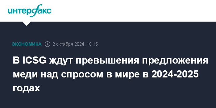 Москва. 2 октября. INTERFAX.RU - Производство рафинированной меди в мире будет выше ее потребления в 2024-2025 годах, прогнозирует Международная исследовательская группа по меди (ICSG).