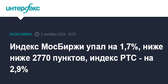 По итогам основных торгов индекс МосБиржи упал на 1,7% до 2766,79 пункта, уровня 1,5-недельной давности, индекс РТС упал на 2,9% до 922,28 пункта; цены большинства "голубых фишек" на "Мосбирже" снизились в пределах 3,9%.