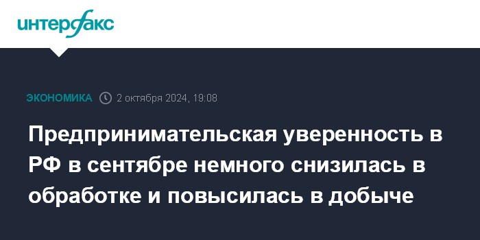 Предпринимательская уверенность в РФ в сентябре немного снизилась в обработке и повысилась в добыче