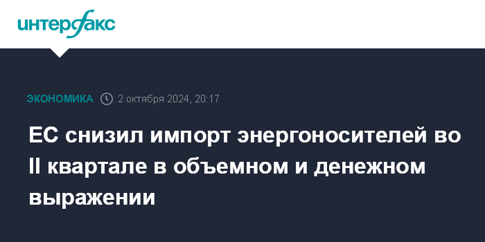 Москва. 2 октября. INTERFAX.RU - Евросоюз во втором квартале 2024 года импортировал 177,9 млн тонн энергоносителей на общую сумму 94,9 млрд евро, сообщило статистическое управление ЕС Eurostat.