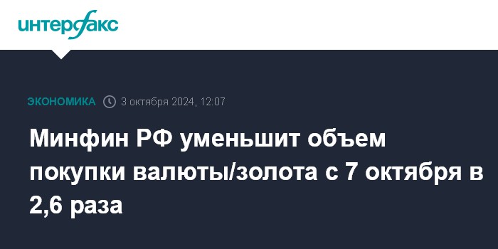 Минфин РФ уменьшит объем покупки валюты/золота с 7 октября в 2,6 раза
