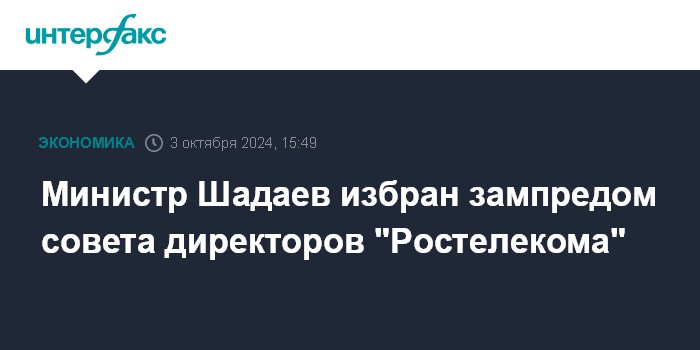 Москва. 3 октября. INTERFAX.RU - Глава Минцифры Максут Шадаев избран заместителем председателя совета директоров ПАО "Ростелеком", сообщил "Интерфаксу" источник, близкий к совету.