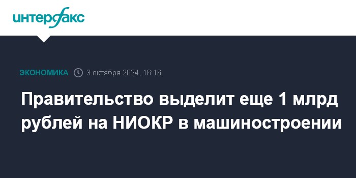 Москва. 3 октября. INTERFAX.RU - Правительство направит дополнительно 1 млрд рублей на проведение научно-исследовательских и опытно-конструкторских работ (НИОКР) в сфере машиностроения, сказал на заседании премьер-министр Михаил Мишустин. Такое распоряжение уже подписано, сообщает сайт правительства.