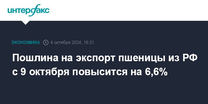 Москва. 4 октября. INTERFAX.RU - Ставка пошлины на экспорт пшеницы с 9 октября повысится на 6,6%. В то же время пошлина на кукурузу, взлетевшая неделей ранее почти в 10 раз, снизится на 3,2%.