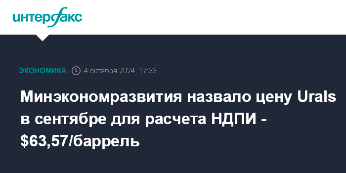 Москва. 4 октября. INTERFAX.RU - Минэкономразвития опубликовало средний уровень цены нефти Urals за сентябрь 2024 года, которая будет применяться для расчета налога на добычу полезных ископаемых (НДПИ) по нефти - $63,57/баррель.