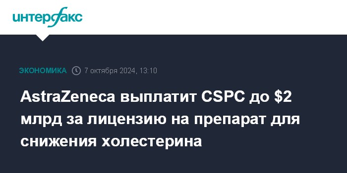 Москва. 7 октября. INTERFAX.RU - Шведско-британская фармкомпания AstraZeneca выплатит до $2,02 млрд китайской CSPC Pharmaceutical в рамках эксклюзивного партнерства в области разработки и коммерциализации препарата для снижения холестерина, говорится в пресс-релизе AstraZeneca.
