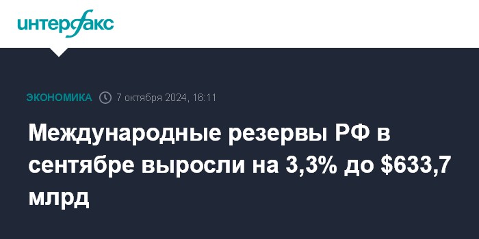 Москва. 7 октября. INTERFAX.RU - Объем международных (золотовалютных) резервов РФ в сентябре 2024 года вырос на $20,022 млрд, или на 3,3%, до $633,737 млрд с $613,715 млрд, следует из информации на сайте ЦБ РФ.