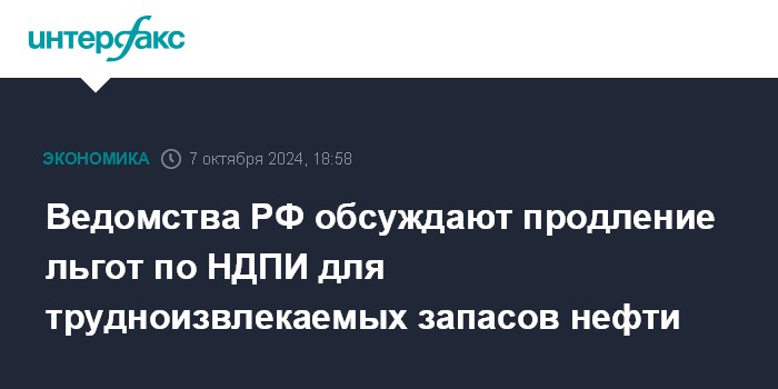 Москва. 7 октября. INTERFAX.RU - Ведомства обсуждают продление льгот по налогу на добычу полезных ископаемых (НДПИ) на нефть по трудноизвлекаемым запасам - баженовским, абалакским, хадумским и доманиковым продуктивным отложениям, а также для месторождения имени Филановского, сообщили "Интерфаксу" несколько источников, знакомых с ситуацией.