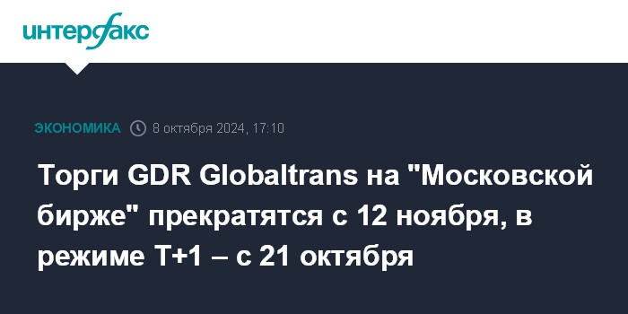 Торги GDR Globaltrans на "Московской бирже" прекратятся с 12 ноября, в режиме Т+1 – с 21 октября