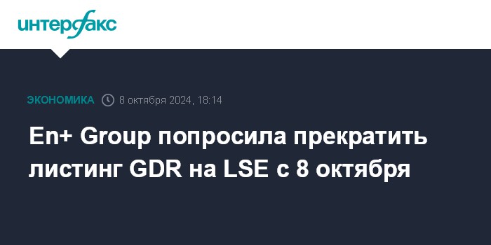 Москва. 8 октября. INTERFAX.RU - En+ Group направила уведомление с просьбой об отмене листинга и допуска к торгам депозитарных расписок компании на Лондонской фондовой бирже (LSE) с 8 октября, говорится в сообщении компании на LSE.
