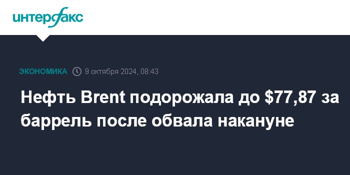 Нефть Brent подорожала до $77,87 за баррель после обвала накануне