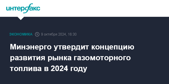 Москва. 9 октября. INTERFAX.RU - Минэнерго рассчитывает до конца 2024 года принять концепцию развития рынка газомоторного топлива (ГМТ), сообщил директор департамента развития газовой отрасли министерства Артем Верхов на Петербургском международном газовом форуме, на заседании комиссии Госсовета по направлению "Энергетика".