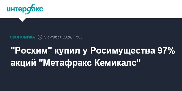 Москва. 9 октября. INTERFAX.RU - АО "Росхим" признано победителем объявленных Росимуществом торгов по продаже почти 97% акций АО "Метафракс Кемикалс" (Пермский край), перешедших в 2023 году в собственность государства.