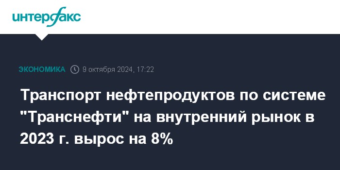 Транспорт нефтепродуктов по системе "Транснефти" на внутренний рынок в 2023 г. вырос на 8%