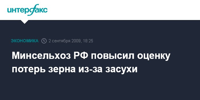 Краснодар. 2 сентября. INTERFAX.RU - Минсельхоз РФ повысил с 11 млн тонн до 13 млн тонн оценку потерь зерна из-за засухи. Как сообщила журналистам в среду в Краснодаре министр сельского хозяйства Елена Скрынник, согласно прогнозу Минсельхоза, суммарный недобор зерна в этом году из-за засухи составит 13 млн тонн.