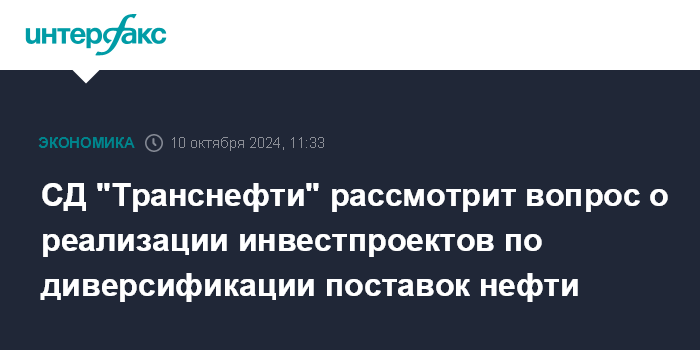 СД "Транснефти" рассмотрит вопрос о реализации инвестпроектов по диверсификации поставок нефти