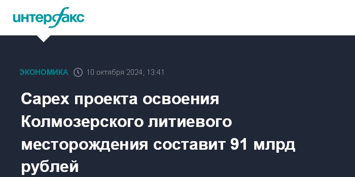 Capex проекта освоения Колмозерского литиевого месторождения составит 91 млрд рублей