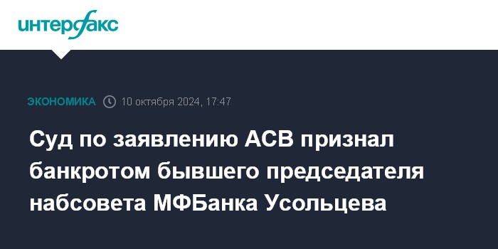 Москва. 10 октября. INTERFAX.RU - Арбитражный суд Москвы по заявлению московского Международного фондового банка (МФБанк) в лице Агентства по страхованию вкладов (АСВ, конкурсный управляющий) признал несостоятельным (банкротом) бывшего председателя наблюдательного совета Евгения Усольцева, следует из картотеки суда.