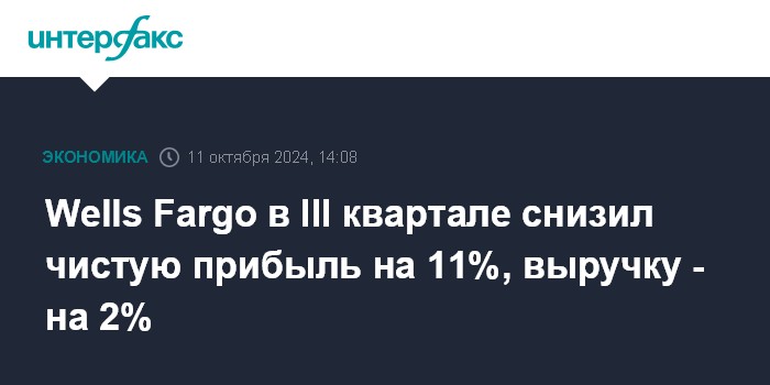 Москва. 11 октября. INTERFAX.RU - Один из крупнейших американских банков Wells Fargo & Co. в третьем квартале 2024 года снизил чистую прибыль на 11,3%, выручку - на 2,4%.