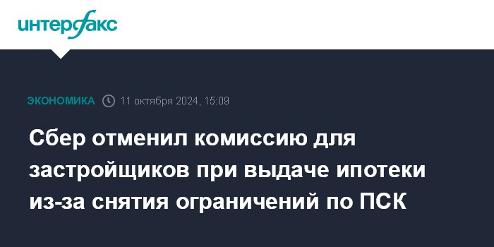 Москва. 11 октября. INTERFAX.RU - Сбербанк перестал брать комиссию с застройщиков при выдаче ипотеки из-за временной отмены регулятором ограничений по полной стоимости кредита (ПСК) по этому виду ссуд.