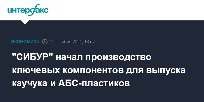 Москва. 11 октября. INTERFAX.RU - "СИБУР" с партнерами начал производство ключевых компонентов, от доступности которых зависит выпуск до 1 млн тонн синтетических каучуков и АБС-пластиков в год.