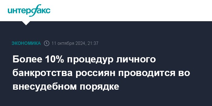Москва. 11 октября. INTERFAX.RU - Каждый девятый россиянин, вошедший в личное банкротство в январе-сентябре 2024 года, сделал это во внесудебном порядке, свидетельствуют данные "Федресурса" (Единый федеральный реестр сведений о банкротстве, fedresurs.ru). Доля внесудебных процедур существенно выросла на фоне увеличения их количества в 4,8 раза, до 38389.