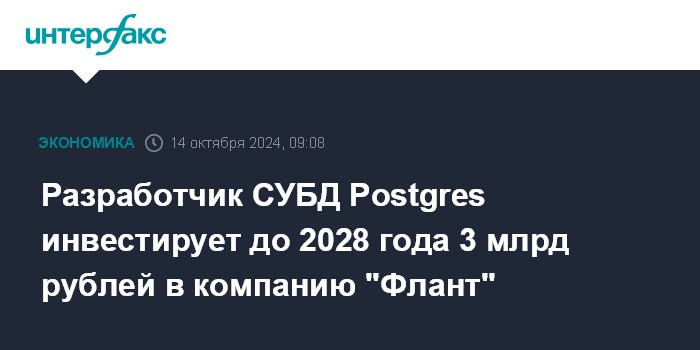 Москва. 14 октября. INTERFAX.RU - ООО "Постгрес профессиональный" (ППГ, Postgres Professional - разработчик системы управления базами данных Postgres Pro) планирует до 2028 года инвестировать в АО "Флант", занимающееся разработкой систем виртуализации, сообщает Postgres.