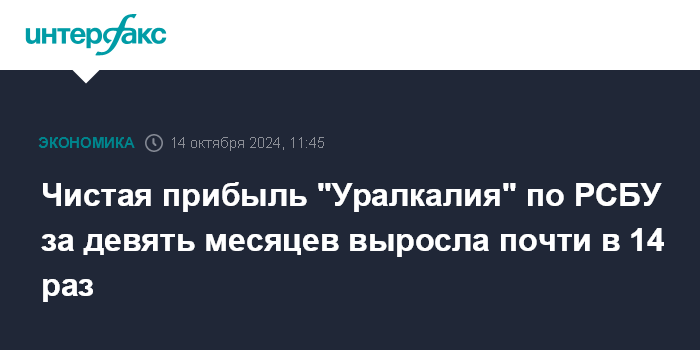 Чистая прибыль "Уралкалия" по РСБУ за девять месяцев выросла почти в 14 раз