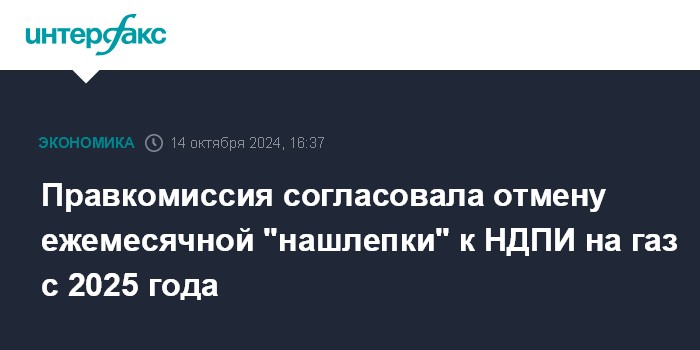 Москва. 14 октября. INTERFAX.RU - Правительственная комиссия по законопроектной деятельности 14 октября согласилась с предложением Минфина досрочно убрать с 2025 года ежемесячную "нашлепку" к НДПИ на газ в размере 50 млрд рублей, рассказал "Интерфаксу" источник, знакомый с подготовкой законопроекта.
