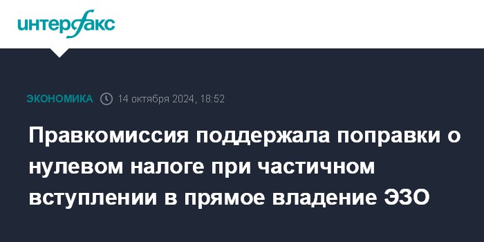 Правкомиссия поддержала поправки о нулевом налоге при частичном вступлении в прямое владение ЭЗО