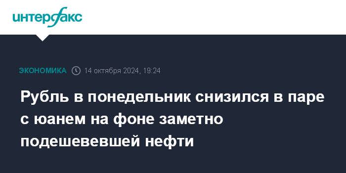 Москва. 14 октября. INTERFAX.RU - Китайский юань вырос на Московской бирже по итогам торгов в понедельник, рубль подешевел на фоне сильного падения цен на нефть. Курс юаня в 19:00 по Москве составил 13,526 руб., что на 6,7 коп. выше уровня закрытия предыдущих торгов.