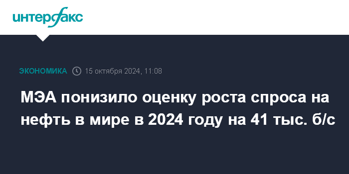 МЭА понизило оценку роста спроса на нефть в мире в 2024 году на 41 тыс. б/с