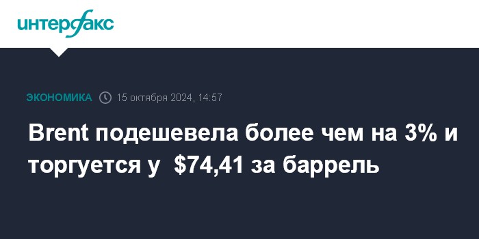 Brent подешевела более чем на 3% и торгуется у $74,41 за баррель
