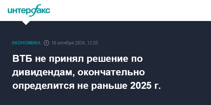 ВТБ не принял решение по дивидендам, окончательно определится не раньше 2025 г.