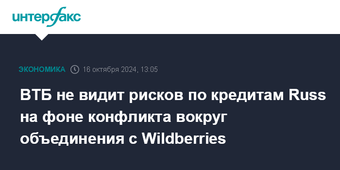 Москва. 16 октября. INTERFAX.RU - Банк ВТБ не видит рисков создания резервов по кредитам группе Russ на фоне развития конфликта, развернувшегося вокруг объединения активов этой компании с Wildberries.