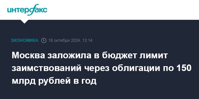 Москва. 16 октября. INTERFAX.RU - Москва закладывает в проект бюджета на 2025 год и плановый период 2026-2027 годов стандартный для последних лет лимит заимствований через облигации - по 150 млрд рублей в год.