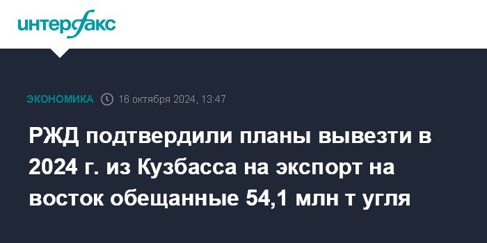 Москва. 16 октября. INTERFAX.RU - ОАО "РЖД" подтверждает намерение вывезти в 2024 году из Кемеровской области на экспорт в восточном направлении обещанные 54,1 млн тонн угля. Об этом сообщает пресс-служба регионального правительства со ссылкой на начальника Западно-Сибирской железной дороги - филиала РЖД Александра Грицая.