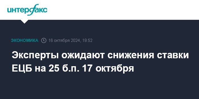 Эксперты ожидают снижения ставки ЕЦБ на 25 б.п. 17 октября