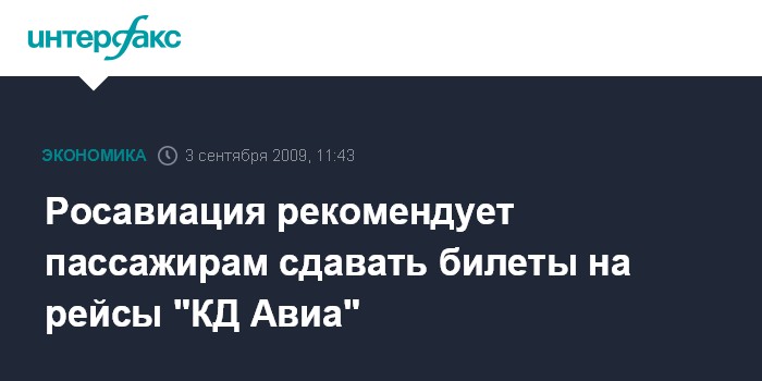 Москва. 3 сентября. INTERFAX.RU - Федеральное агентство воздушного транспорта (Росавиация) рекомендует пассажирам отказаться от услуг авиакомпании "КД Авиа" и сдавать билеты на ее рейсы.