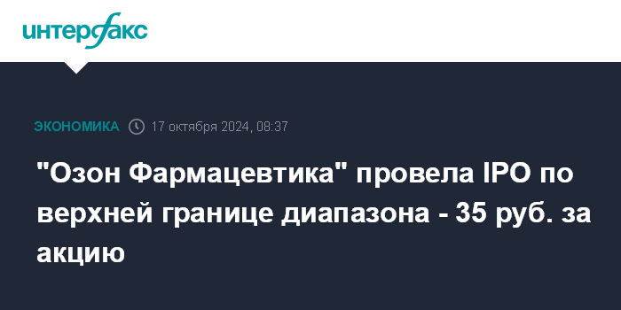 Москва. 17 октября. INTERFAX.RU - ПАО "Озон Фармацевтика" (Тольятти, Самарская область) в рамках проведенного IPO разместило акции по цене 35 рублей за бумагу, говорится в сообщении компании.